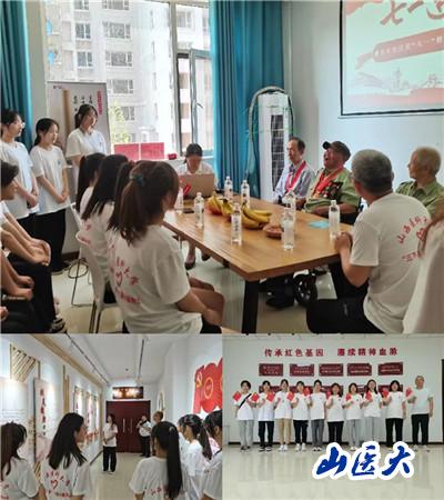 7月1日,实践队来到荣军社区,聆听老党员讲述他们的奋斗历史和光荣事迹。轮椅上失去双腿的老党员张保发声情并茂地讲述了自己从十四岁参军、十八岁入党,到唱着《中国人民志愿军军歌》走上抗美援朝战场,与战友们浴血奋战,最终夺取战争胜利的英雄故事。尽管他把双腿留在了朝鲜战场,至今已在轮椅上度过60多年,但他积极乐观的精神却让同学们肃然起敬。