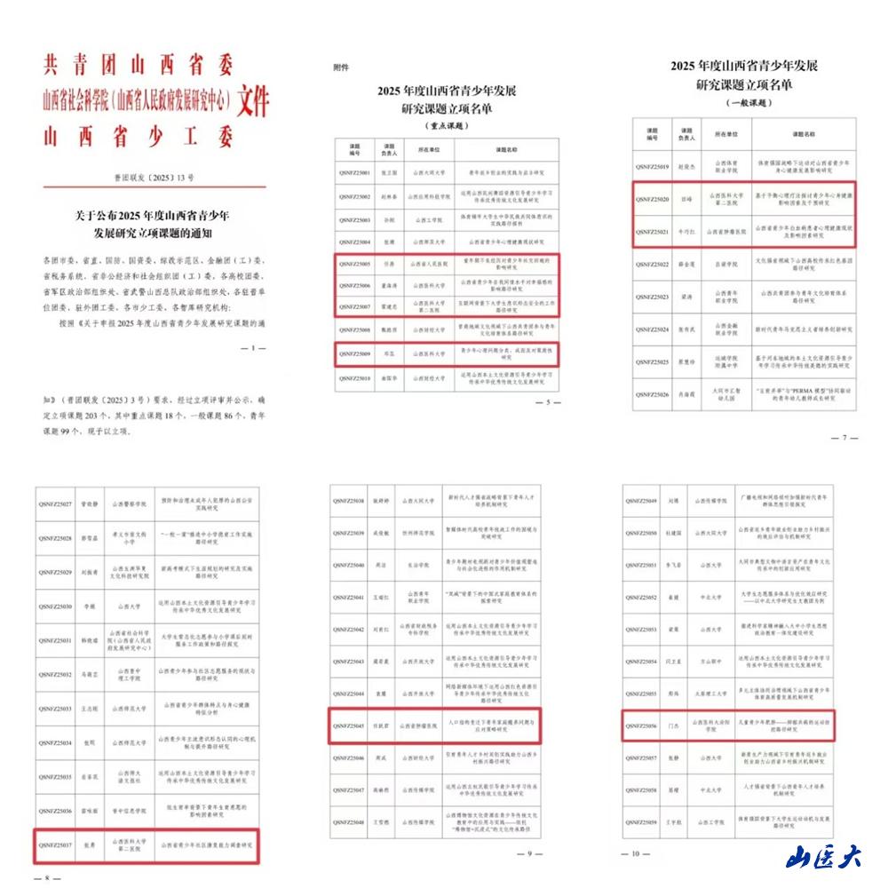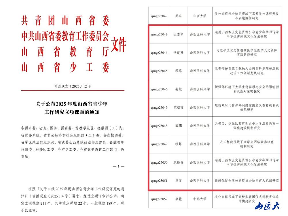 近日,共青团山西省委、山西省社会科学院(山西省人民政府发展研究中心)、山西省少工委联合发布了2025年度山西省青少年发展研究课题和山西省青少年工作研究课题立项通知,我校及附属医院申报的26个课题获批立项。