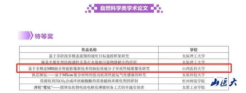 6月6日至7日,在第十九届“挑战杯”山西省大学生课外学术科技作品竞赛终审决赛中,由我校医学影像学院2022级医学影像技术专业本科生牛文举作为团队第一负责人,张辉、杨国强、张琪三位老师作为指导教师的题为“基于多模态MRI融合智能影像新技术的脑胶质瘤分子异质性精准量化研究”项目在自然科学类学术论文赛道斩获省特等奖,不仅成为我校今年在该赛道唯一荣获特等奖的作品,更实现了我校医学影像学院在“挑战杯”赛事该赛道上的突破。