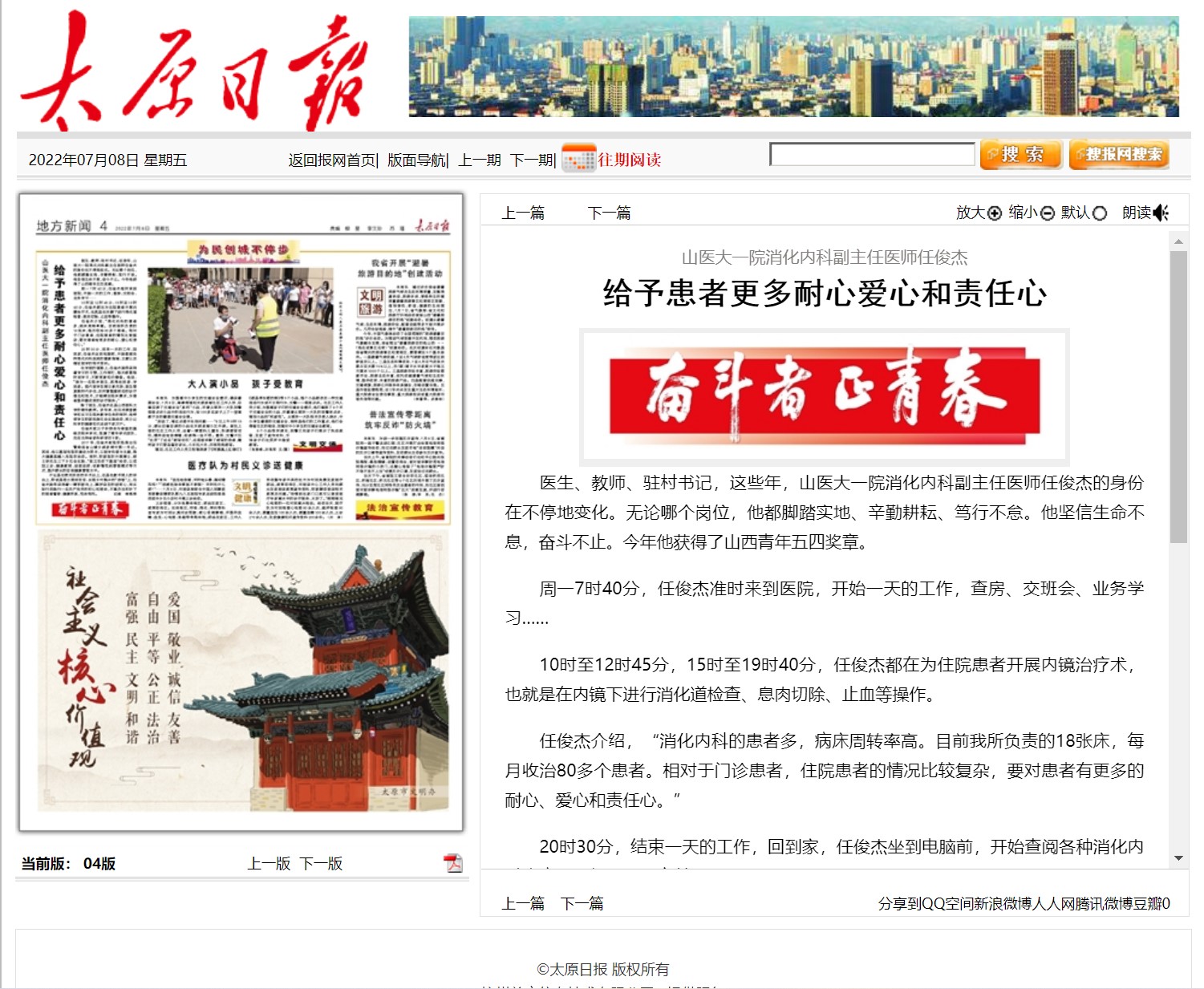 太原日报︱山医大一院消化内科副主任医师任俊杰:给予患者更多耐心爱心和责任心