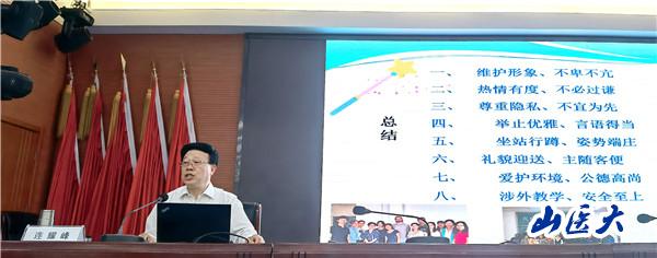 连耀峰在涉外礼仪专题培训中,重点讲授了涉外通则和礼仪要求,并对国际学生实习导师工作有针对性开展指导,鼓励大家不断提升医学国际教育工作能力。