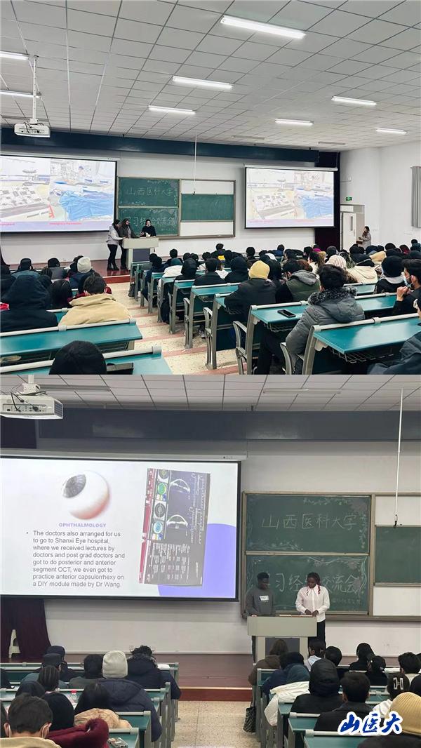 学长学姐围绕在第一临床医学院、第二临床医学院、第三临床医学院(山西省白求恩医院)、第五临床医学院(山西省人民医院)、山西省肿瘤医院的实习和见习经历展开了深入的交流分享。他们既介绍了各实习见习医院的特点和管理要求、实习见习前要做的准备,也讲述了自己在实习中的所见所闻,学习到的师生及医患沟通技巧等体会感悟,鼓励学弟学妹们要端正学习态度,严肃学习纪律,及早提升汉语水平,为未来的实习见习打下坚实的理论和语言基础。