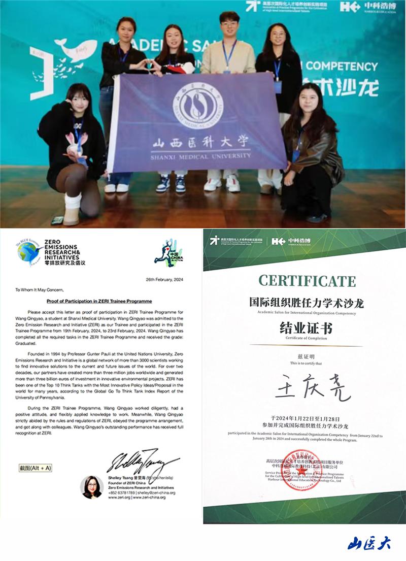 2024年寒假,我校公共卫生学院6名同学由学校奖学金支持,参加了“高层次国际化人才培养创新实践项目——国际组织胜任力学术沙龙”,表现优异,顺利获得结业证书。其中,王庆尧、王元昊、常铭洋和祝思迪圆满完成国际组织——零排放研究和倡议的线上见习工作,获得见习证书。