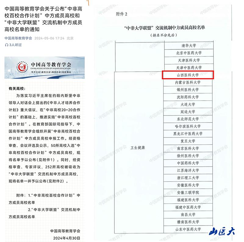近年来,我校积极响应、主动对接国家对外开放战略,致力于中非医学教育合作。自1981年山西向吉布提、1975年向喀麦隆派遣医疗队以来,我校多次承办山西省卫健委援非医疗队法语培训班,积极参与山西省援非医疗工作。我校附属医院、优秀毕业生共计300余名主动请缨赴喀麦隆、多哥、吉布提,多次赢得受援国荣誉。学校将继续积极发挥中外文化交流的桥梁纽带作用,深化拓展与非洲、阿拉伯国家高校间的教育交流与合作,深入推进开放融合国际化战略,提升国际化办学水平。
