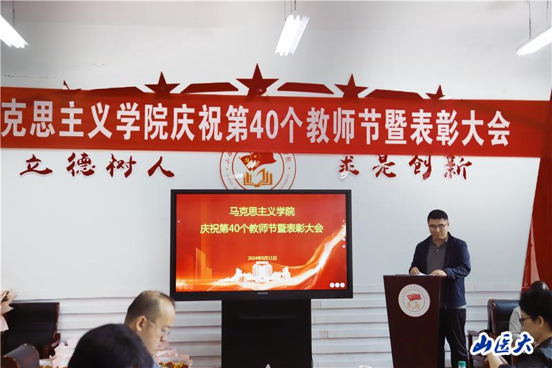 为庆祝第40个教师节,大力弘扬教育家精神,传承尊师重教的传统美德,表彰在教育教学、科研、管理、服务工作中涌现出的先进典型。马克思主义学院于9月11日下午举行了庆祝第40个教师节暨表彰大会。学校人事部(教师工作部)部长毛红胜出席会议,马克思主义学院党政领导班子成员、全体教师参加了会议。马克思主义学院副院长(主持工作)王绍源主持会议。