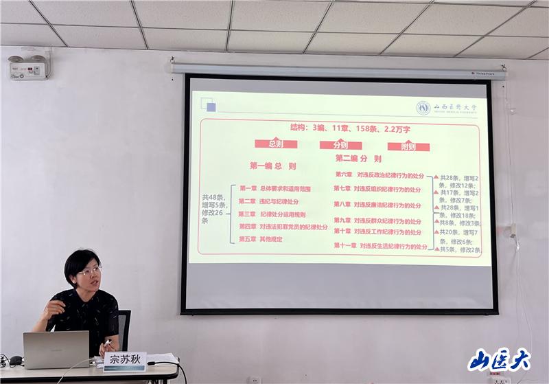 宗苏秋对《中国共产党纪律处分条例》中第六章内容“对违反政治纪律行为的处分”进行专题解读。她介绍了《中国共产党纪律处分条例》修订背景及要求,阐述了六大纪律中最重要的纪律——政治纪律,通过剖析一个个鲜活的违纪典型案例,生动解读了“政治攀附”“政治骗子”等新增及修改条例内容,以案说纪、以案说法,让党员、干部受警醒、明底线、知敬畏。